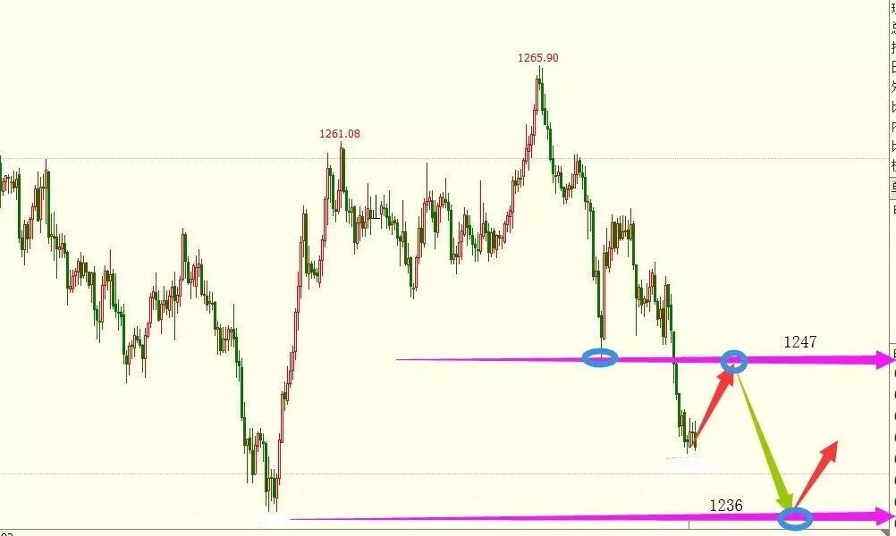 市场有句话,在上涨趋势中如有大阳就能见顶,在下降趋势中如有大阴就能见底,这句话包含了一定的哲理性,昨天的大阴是不是也会出现这样的情况,我们不得而知。但是目前金价运行的区域支撑重重,首先1236-1238大家公认的重要支撑区域,还未破位,另外周线级别的上升趋势线支撑位1241一线,也一切安好。今天的行情要一下突破两大支撑区域,我看够呛,即使突破尾盘反弹的几率也较大,所以我个人倾向于在这个区域吸多,当然保险一点的位置就是1236一线。另外在价格没有冲击下方支撑区域的情况下,价格回调至1247的压力区域还是可以短空,下看1241应该问题不大。